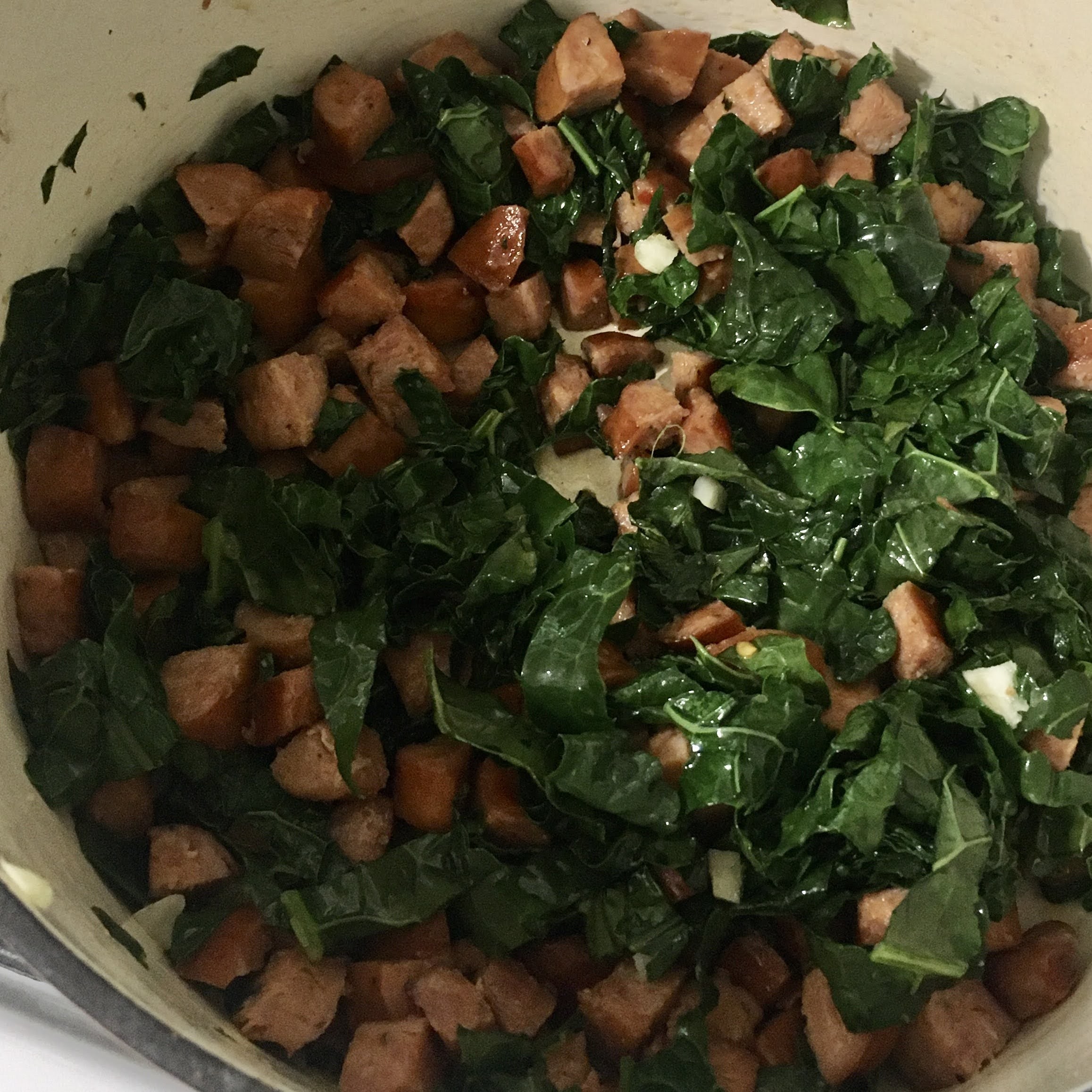 - Add garlic and kale to onions and cook until kale softens.