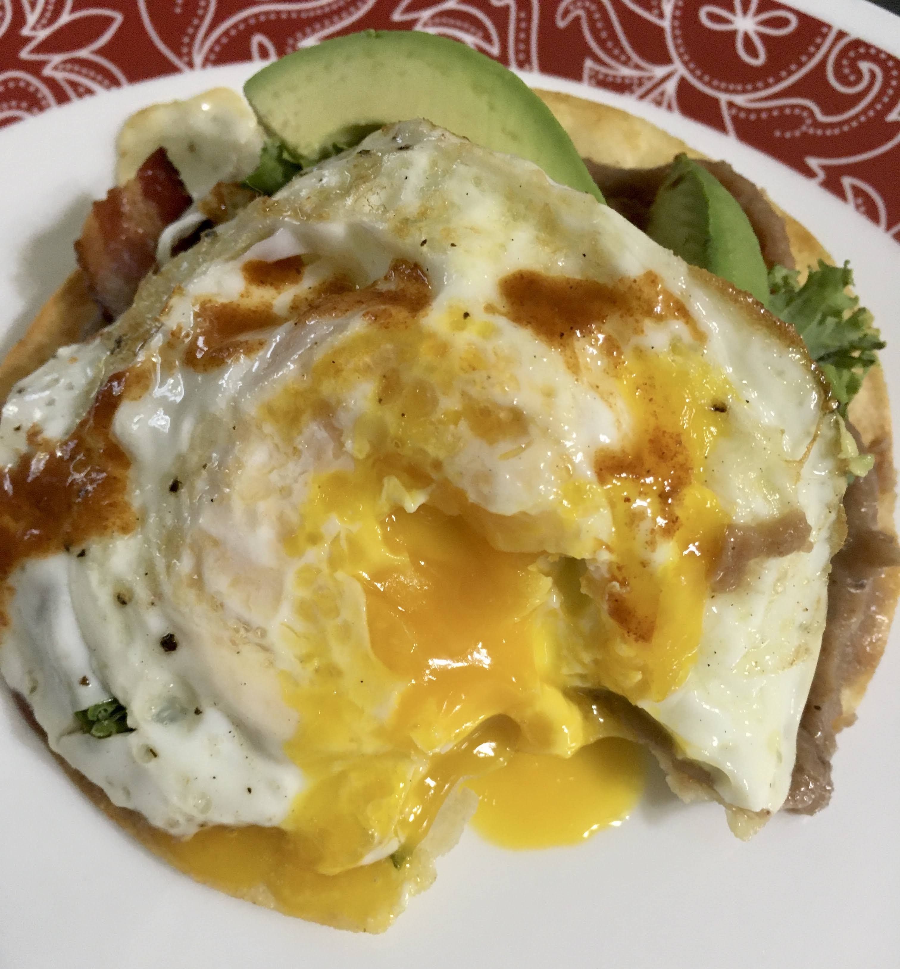 - Spread beans on a crispy tortilla, add slice of bacon, drizzle with enchilada sauce, and top with egg.