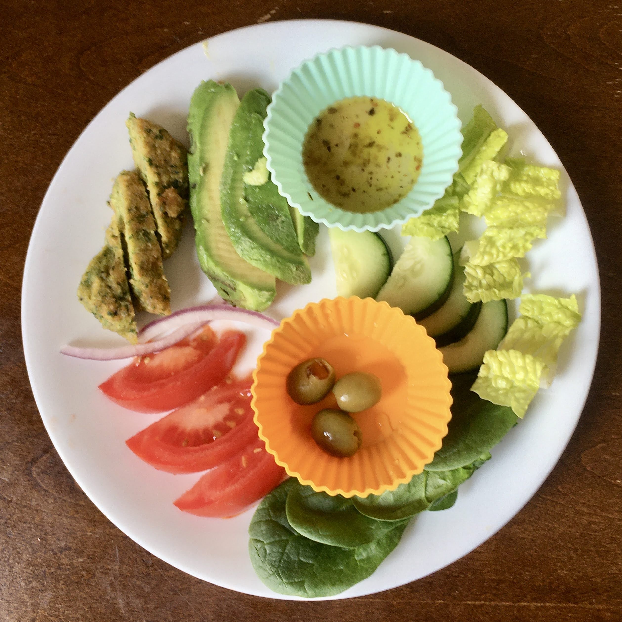 Trying a small salad at snack time can be a lower pressure environment. Both of you know that a meal is coming soon, so there is no worry that they will go hungry for long.