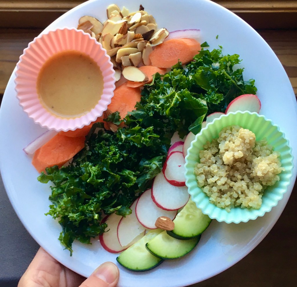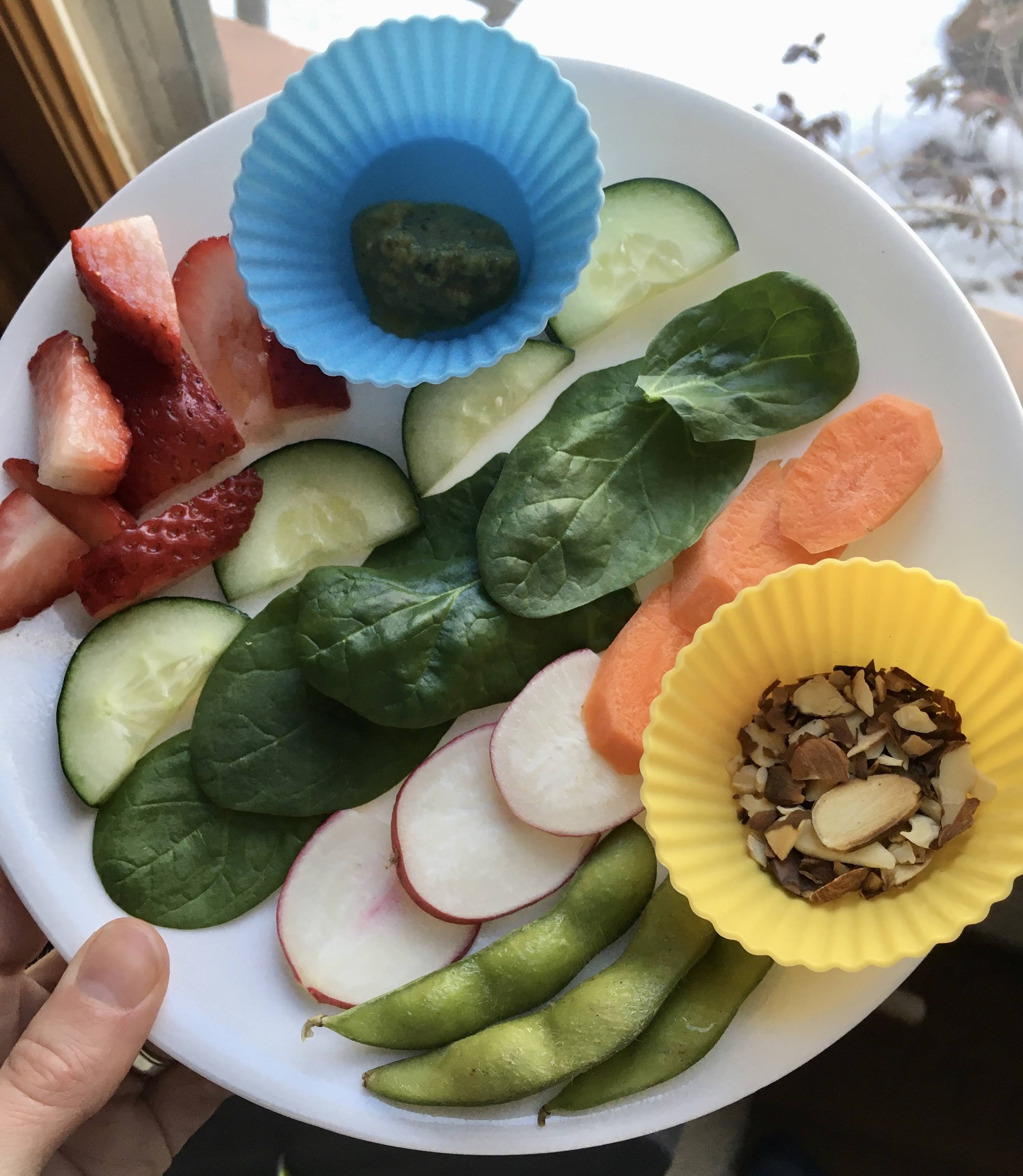 Raw veggies are full of vitamins, minerals, and fiber, but they are not very satiating. Satiation typically comes from fat. We want to make sure we have some fat and protein in the salad so that they feel full and satisfied. This can be boiled eggs, cheese, butter on toast, nuts or seeds (after age 4), or yummy dressing.