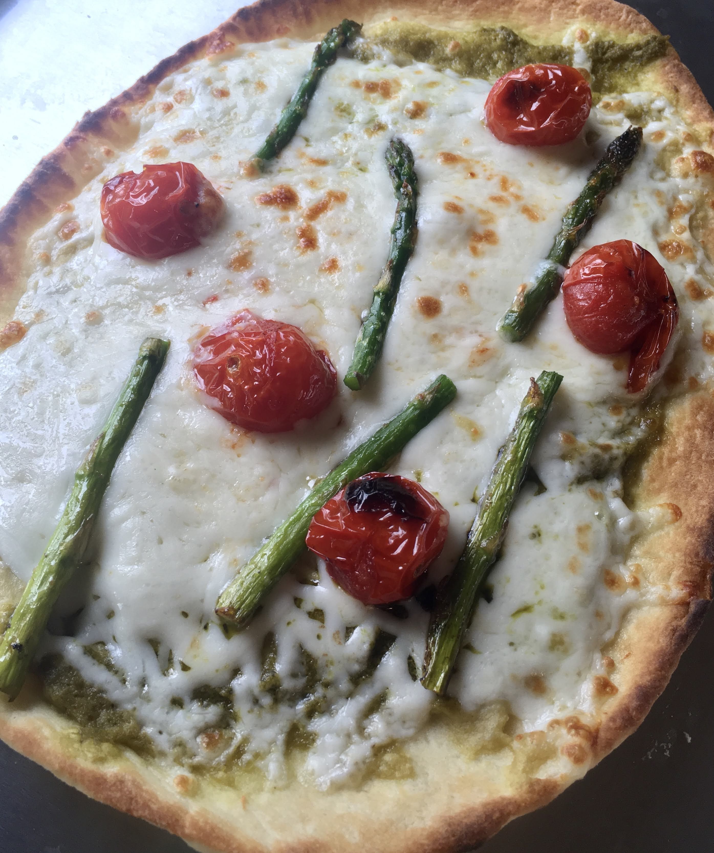 This pizza fit my mood perfectly. Nothing screams spring like asparagus and pesto. I love how creamy the hummus makes the pizza, and it was a refreshing change of pace from the usual marinara.