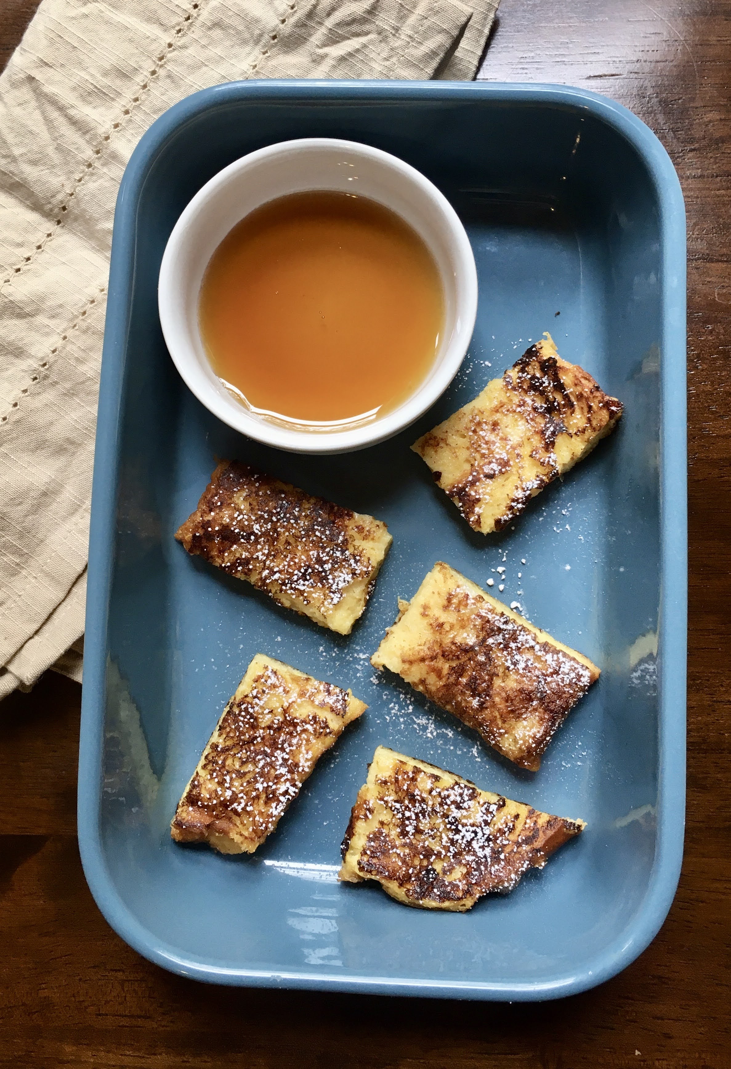 - Slice into 1 inch strips and serve with a small ramekin of maple syrup.