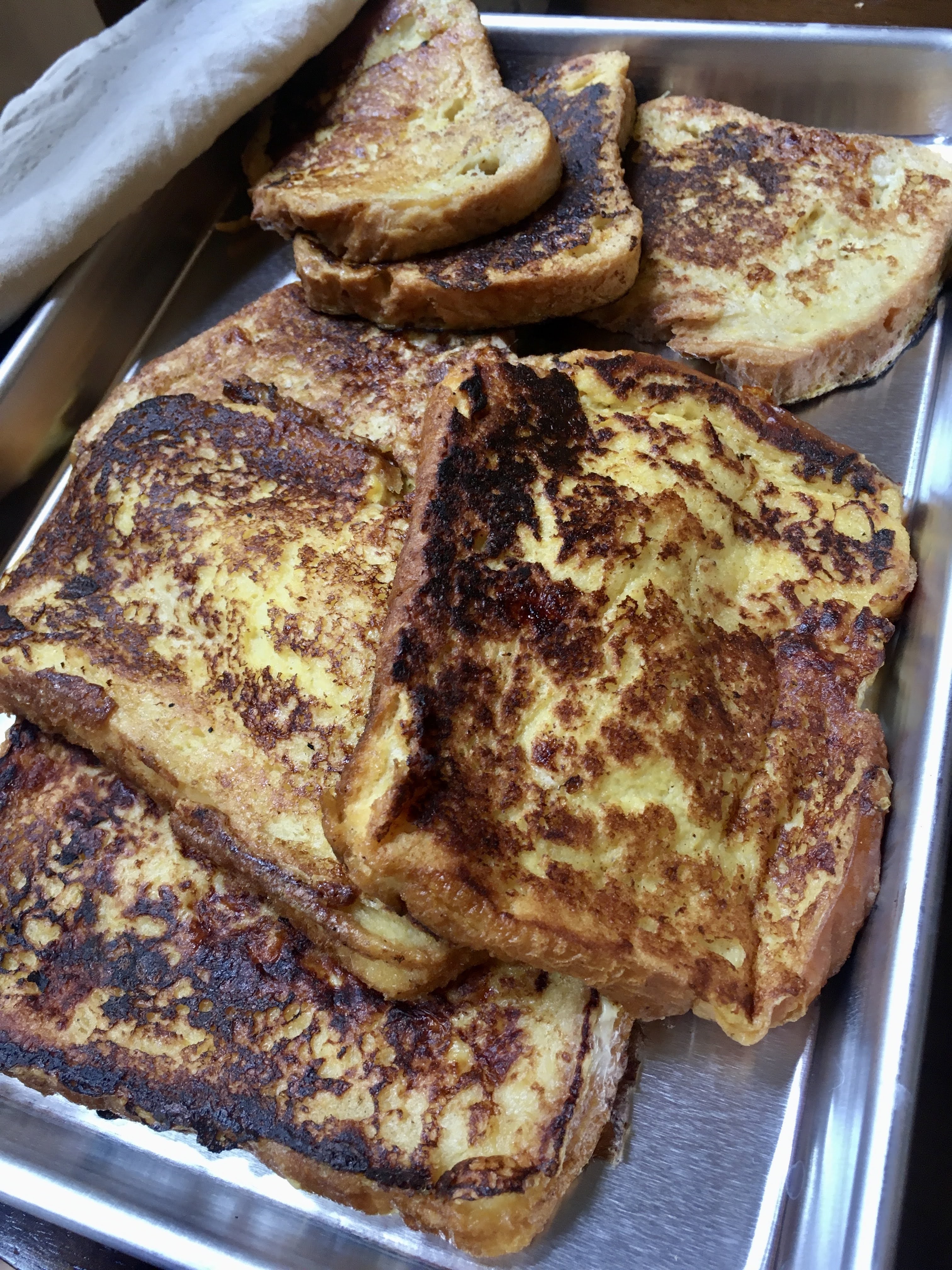 - Whisk together eggs, milk, orange juice, salt, sugar, cinnamon, and vanilla. Pour into large, rimmed baking sheet.