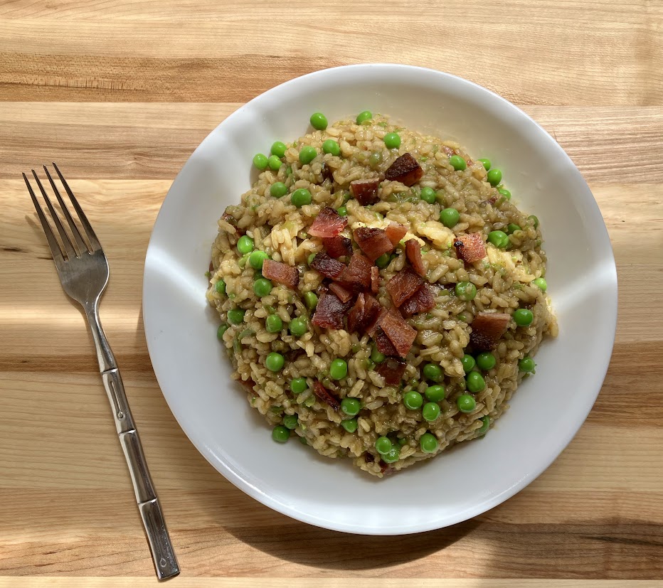 Sometimes the slow way, is the best way. This pea and bacon risotto cooks low and slow over the stove, and the wait is worth it. The slow addition of broth allows the rice to plump and absorb maximum flavor.