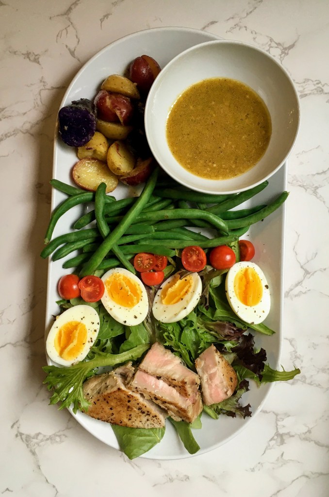 - Arrange spring mix on a large platter. Pour the rest of your dressing into a small bowl with a serving spoon. Add potatoes, tuna steaks, boiled eggs, and blanched green beans to platter.