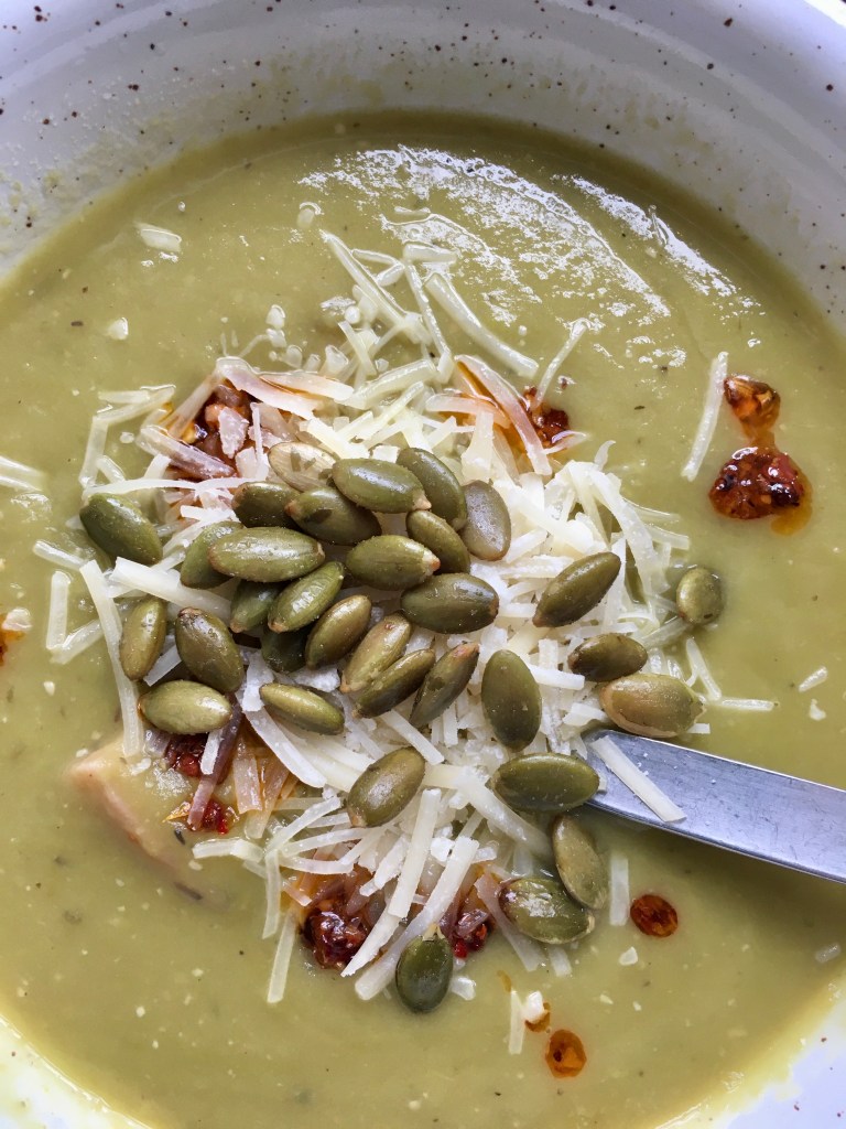 The first time I made split pea soup, I was still in college and actually thought I was using green lentils to make lentil soup. When it came out tasting like peas, I realized my mistake. 12 years later, here I am still making split pea soup, but this version is much better than my failed attempt at making lentil soup. I love how simple this version is. I highly recommend adding the suggested condiments on top. Feel free to throw anything crunchy, cheesy, or otherwise flavorful on top in place of the suggested condiments. Some good subs would be whatever cheese is in your fridge, any kind of nut, croutons, toast to dip, or sriracha.