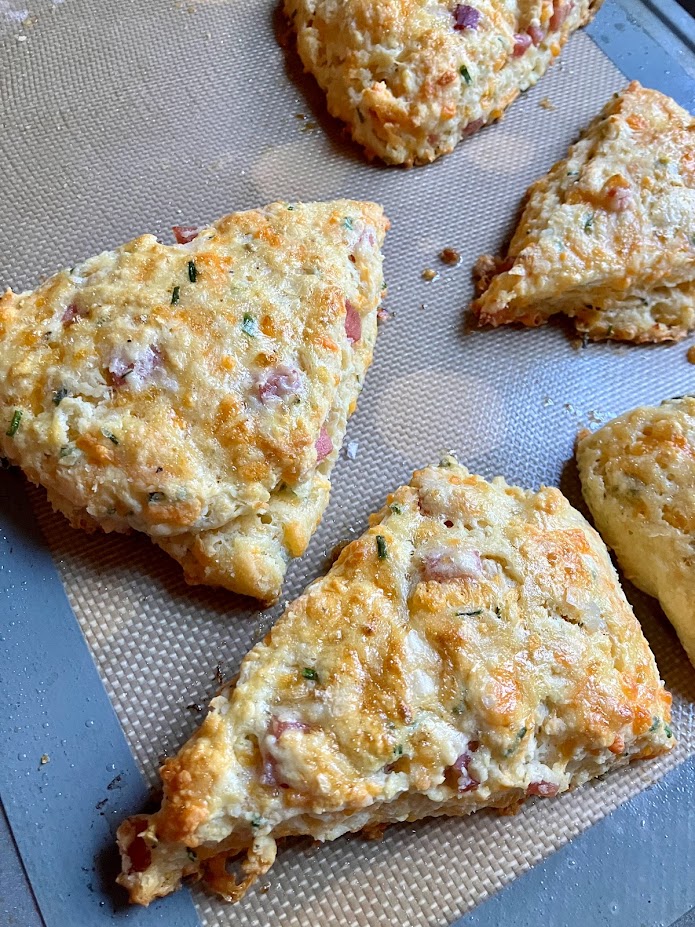 All over the country, we are having snow and cold in unexpected places. These ham and cheddar scones are the perfect antidote to this polar vortex. Not only does morning baking warm up my kitchen, but it draws my grumpy, cold kids out of bed with a smile on because they smell something yummy happening downstairs. If your kids are unfamiliar with scones, I usually describe that as a biscuit with yummy stuff mixed all around instead of just in between.