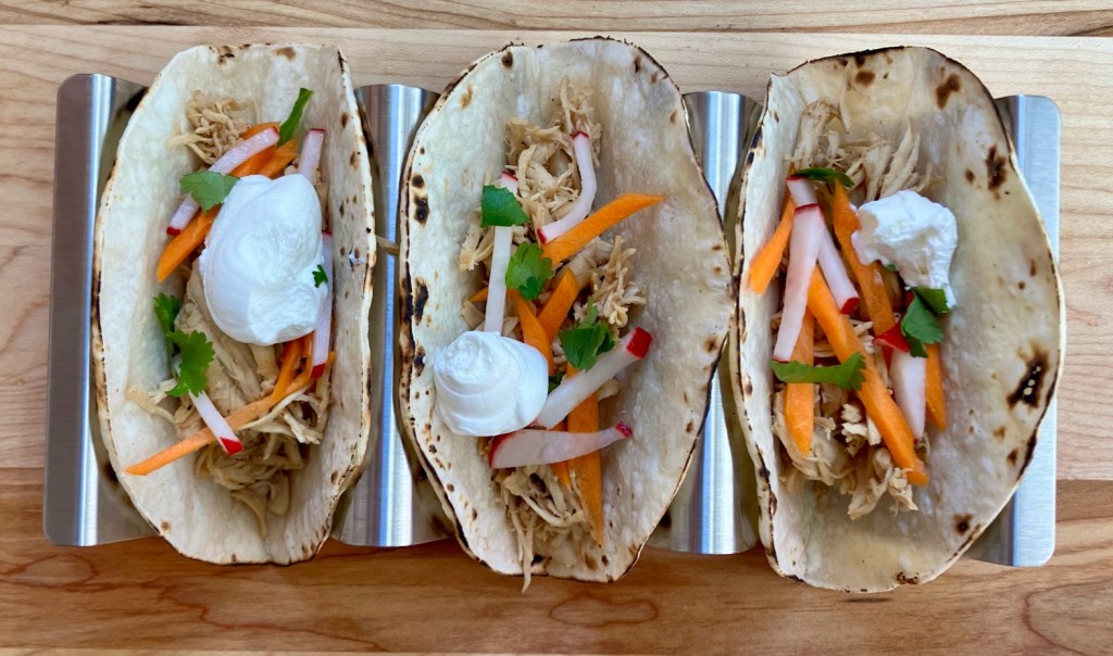 - Serve chicken with pickled vegetables, lettuce, sour cream, tortillas, and extra sriracha for those that like it spicy.