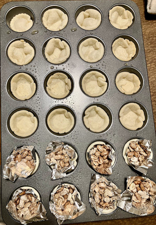 - Place a mini muffin tin liner on top of your dough, and fill with pie weights, dried beans, or dried rice. You just need something to weigh it down while it bakes.