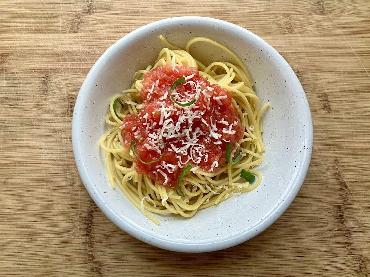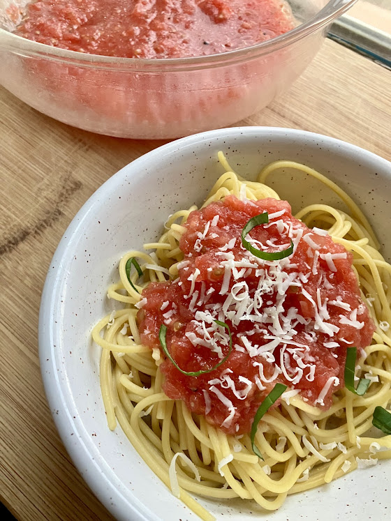 Make sure a grown up does the grating of the tomato, unless you have a rotary grater or food mill like we use in class. This keeps little hands away from the sharp box grater. You don’t use the skin of the tomato for this sauce, only the flesh. This is what allows you to leave this sauce raw. This recipe is perfect for the heat of summer when you don’t want to heat up your stove and kitchen!