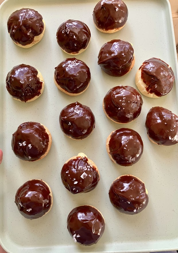 I adore these little puffs. They have all the decadence of éclairs, but in a smaller format. The filling is the best vanilla pudding in the world, surrounded by a lovely little pastry, and then topped with rich ganache. It is the perfect little package.